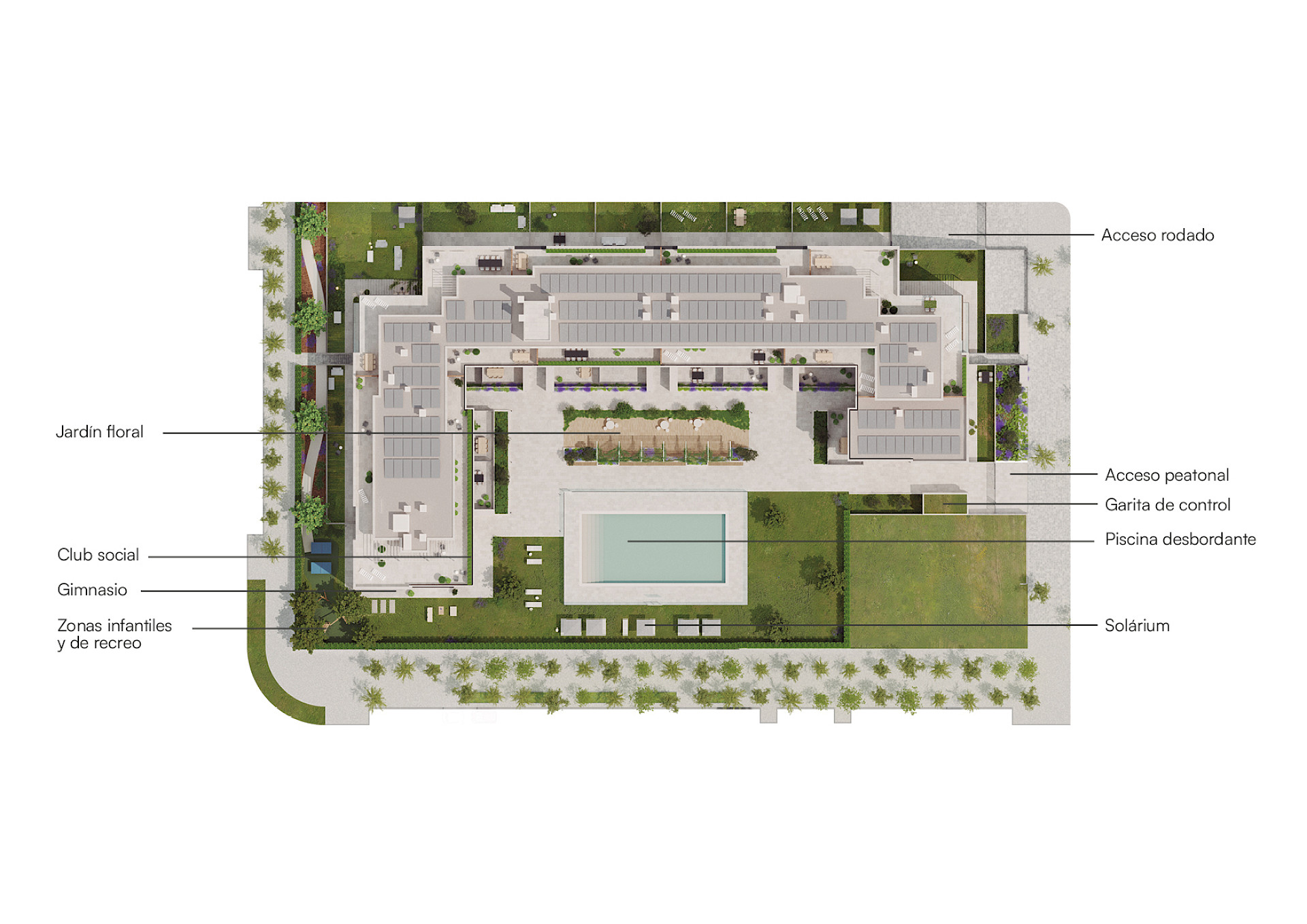 Las viviendas disfrutan de vistas a esta zona, con una piscina rodeada de jardines y espacios de encuentro, creando el lugar perfecto para desconectar y compartir momentos en familia. La urbanización ha sido concebida con la máxima seguridad en mente, resguardando la privacidad de las viviendas en planta baja y contando con un acceso controlado por conserjería, lo que garantiza una mayor tranquilidad a los residentes.