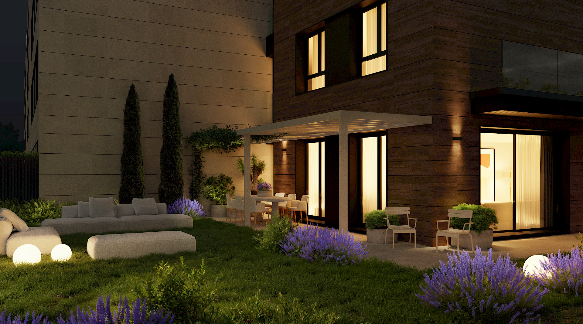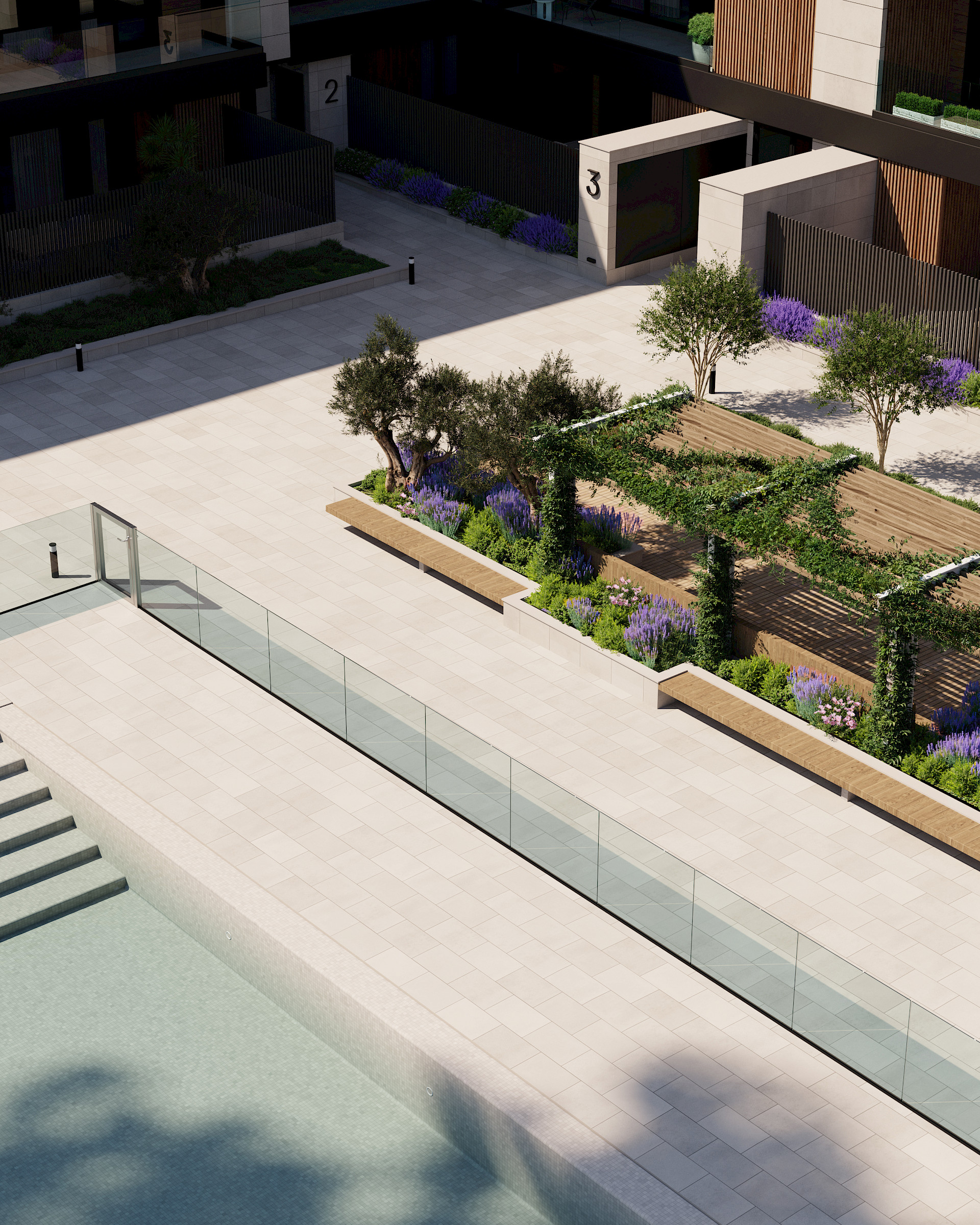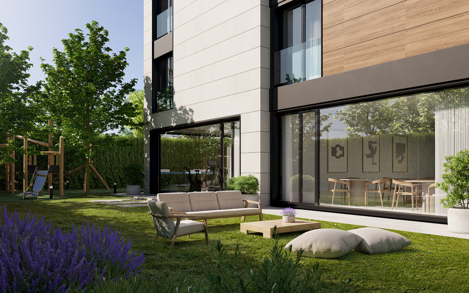 La promoción de viviendas se integra en un entorno diseñado para el bienestar. El acceso peatonal desde la calle atraviesa un jardín sereno, con amplias zonas verdes que invitan al descanso. El bloque en forma de U enmarca un espacio central donde la calma y el ocio conviven en armonía.