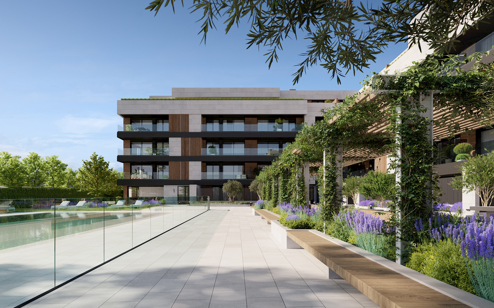 Las viviendas disfrutan de vistas a esta zona, con una piscina rodeada de jardines y espacios de encuentro, creando el lugar perfecto para desconectar y compartir momentos en familia. La urbanización ha sido concebida con la máxima seguridad en mente, resguardando la privacidad de las viviendas en planta baja y contando con un acceso controlado por conserjería, lo que garantiza una mayor tranquilidad a los residentes.